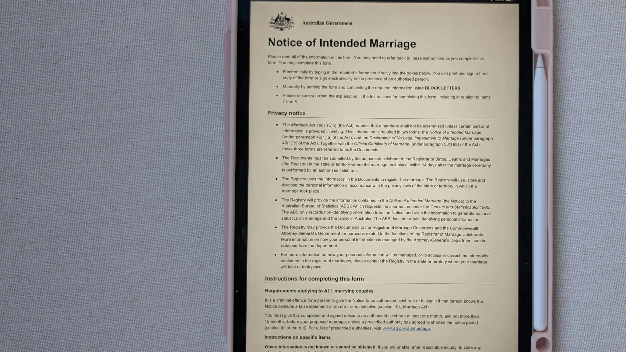 The first legal step towards getting married! I have a custom webform for gathering all your information so I can automate all your marriage paperwork and avoid typos. I’ll send you an already-reviewed PDF version of your NOIM and we will do a remote witnessing video call at a time of your choosing to get it signed and lodged a minimum of one calendar month before your big day. Simples!